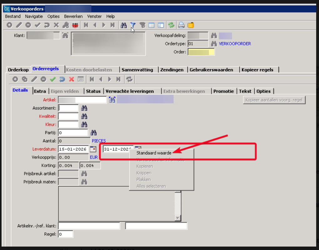 Na het aanpassen van de standaardwaarde wordt bij nieuwe orders weer de correcte leverdatum getoond.