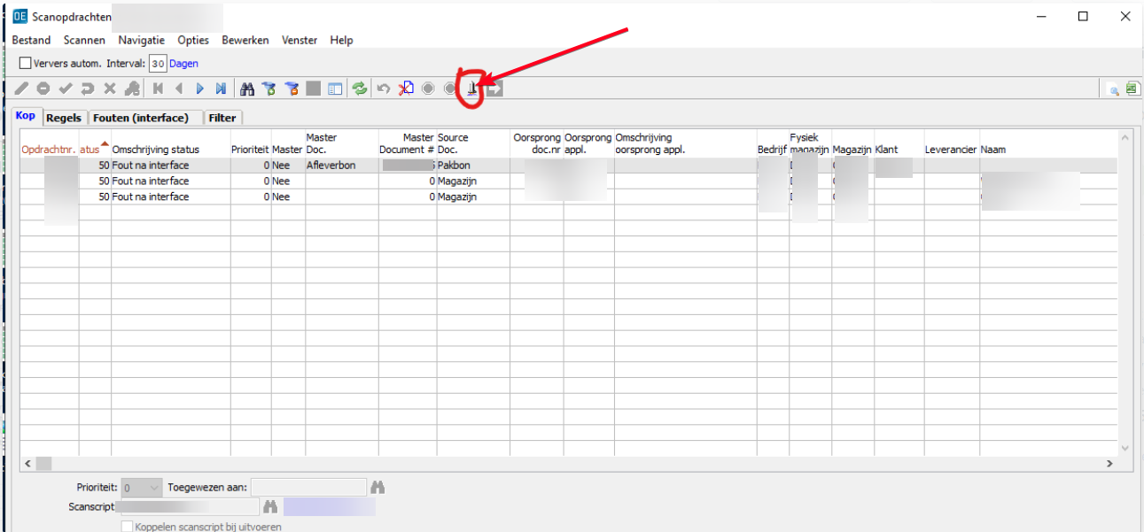 Controleer of de betreffende afleverbon of pakbon de melding Fout in interface heeft
